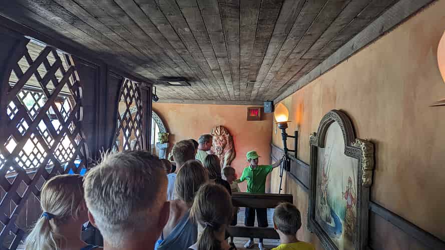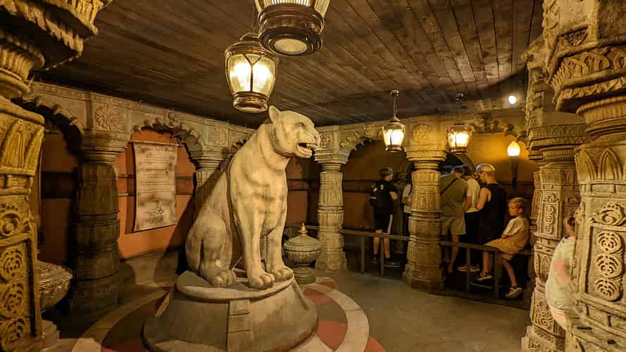 The queue is unusual in that it doesn't really afford riders view of the attraction in action. Instead it routes through an elaborate underground temple.