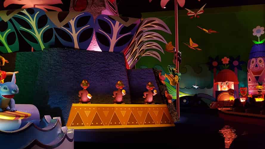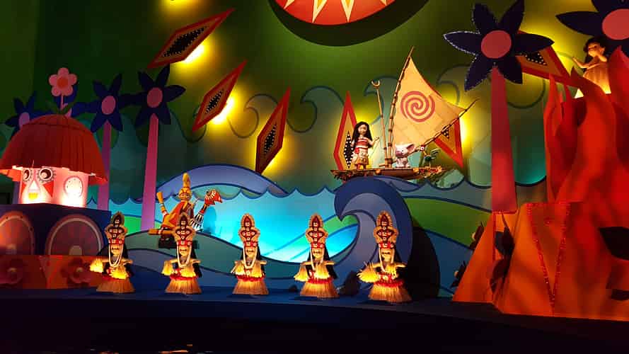 The boats float past scenes themed around various countries around the world.