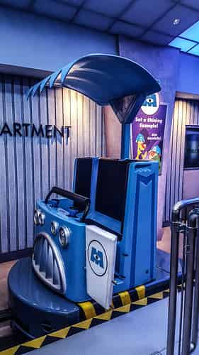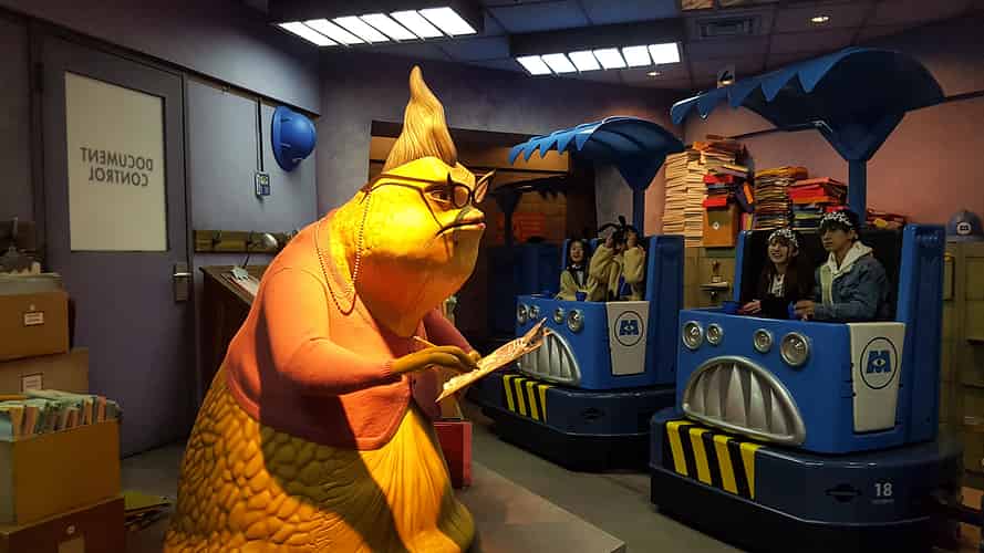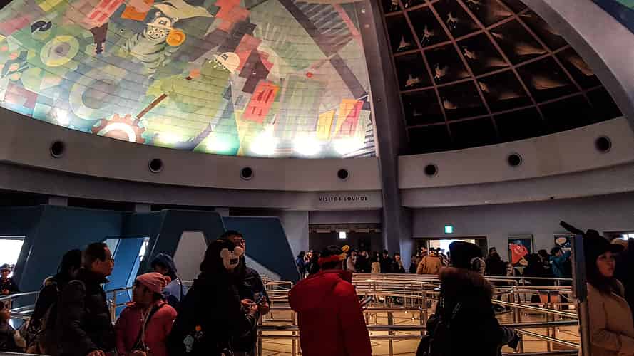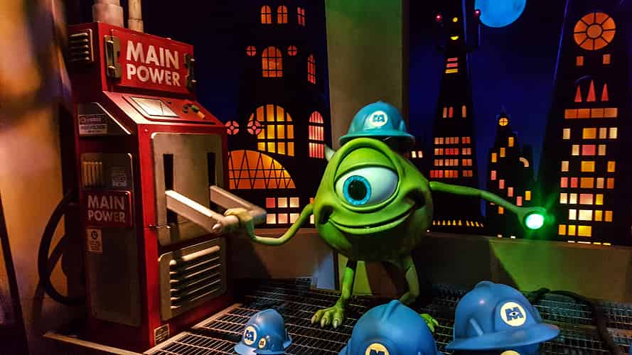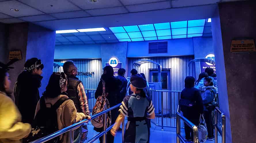 The queue enters the iconic foyer of Monsters Inc.