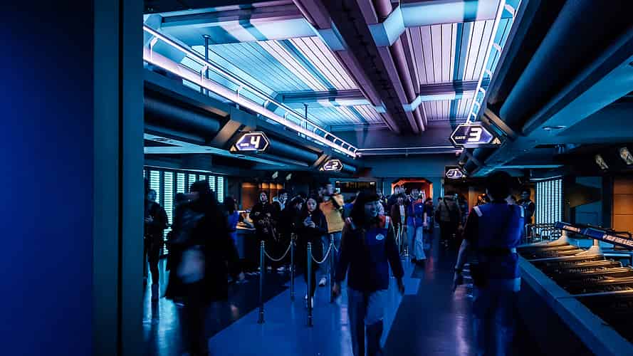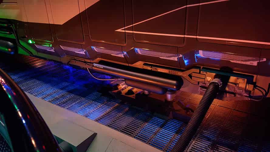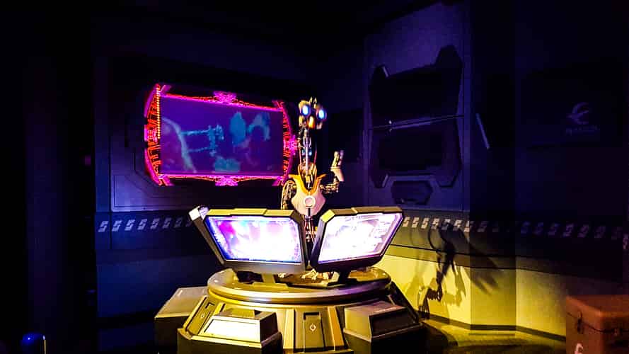 The ride follows a story that you are on a space flight between planets. Of course, not everything goes as planned and you find yourself in the middle of an intergalactic war.