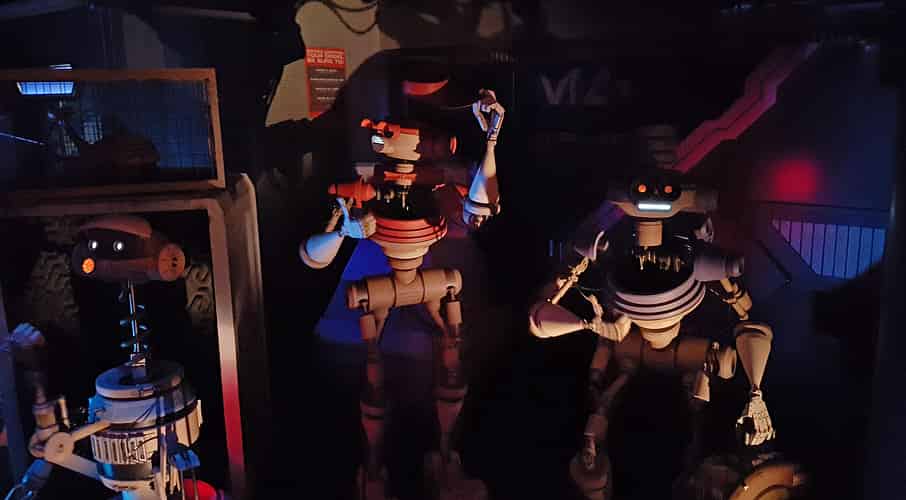 Hitchhiking droids. A nod to the hitchhiking spirits in Haunted Mansion.