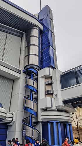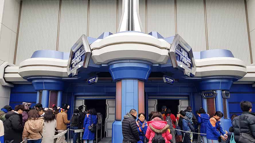The theming attempts to merge the Star Wars style with the overall look of Tommorrowland.