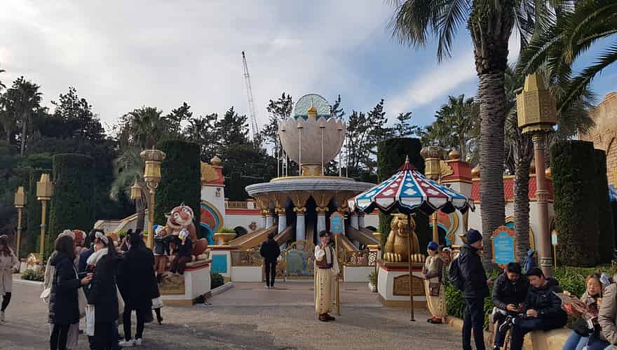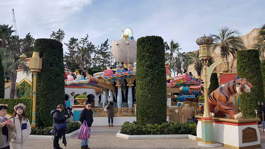The ride is a highly themed "Dumbo" style spinning ride, with the carpets rising up and down as the ride spins.