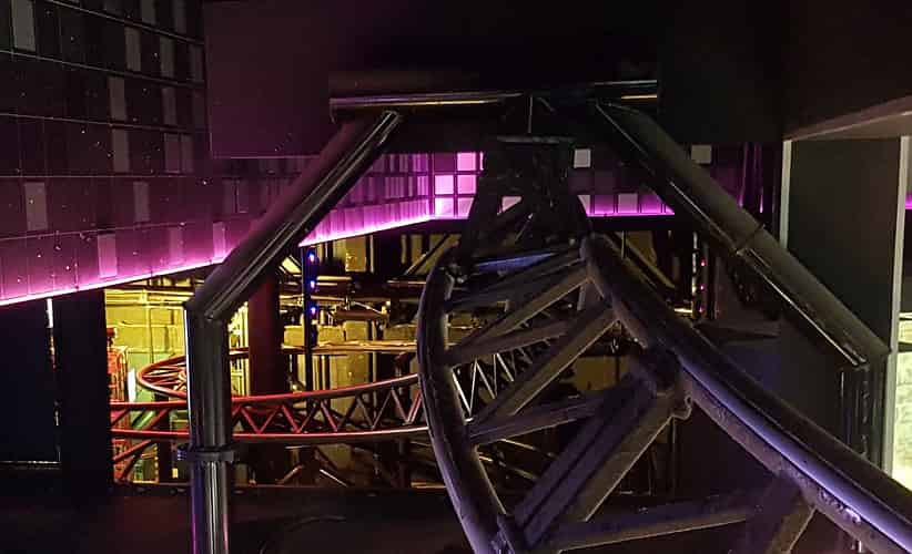 The view when you enter, with a tangle of attractions and nightclub like lighting.