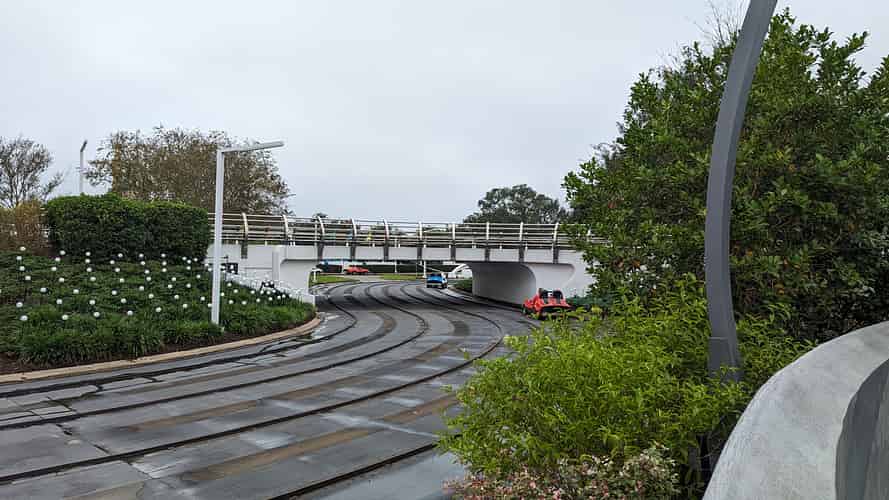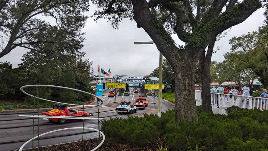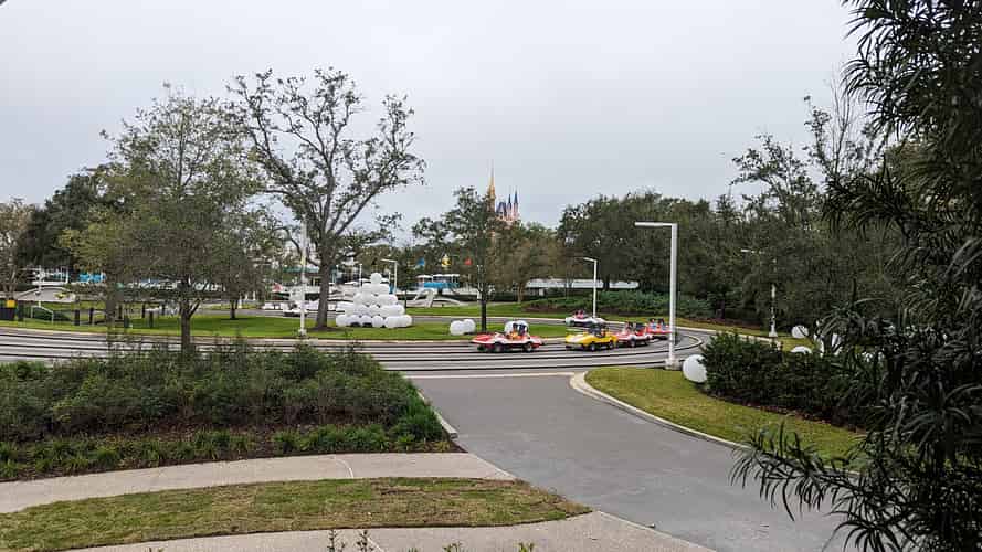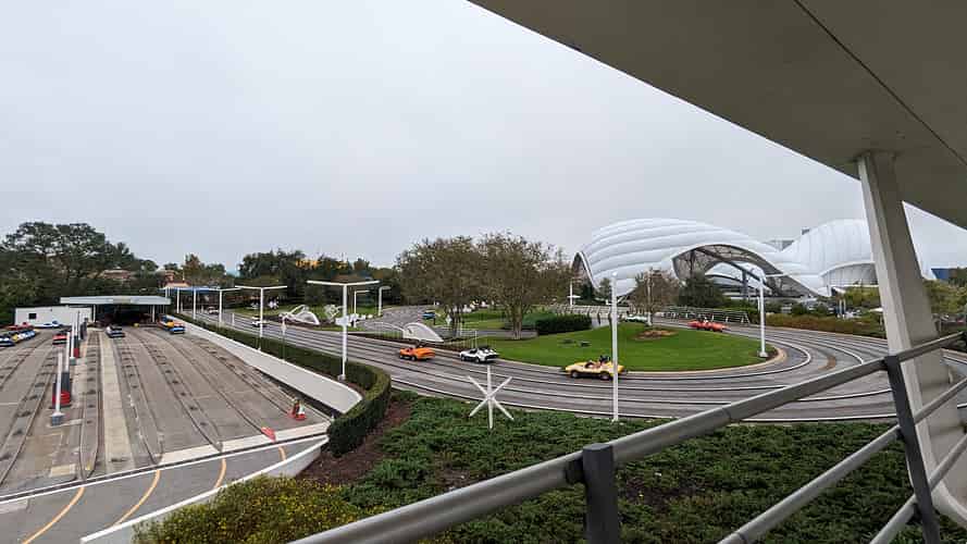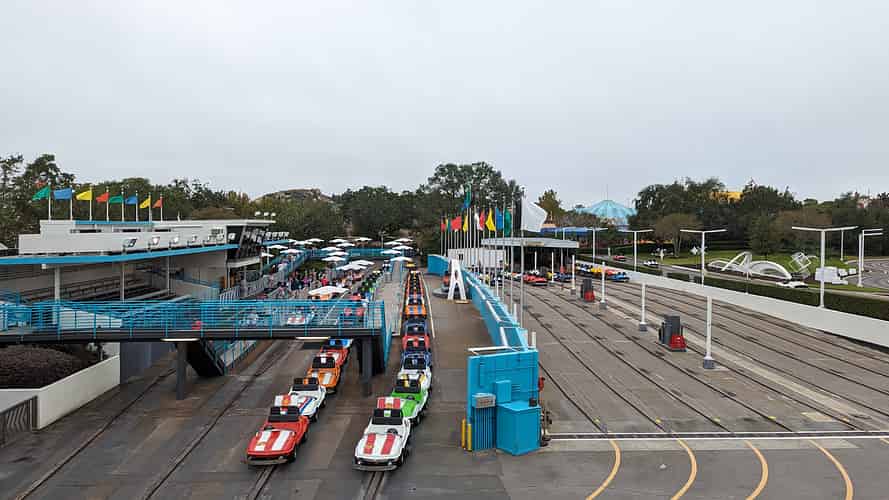 Tommorowland Indy Speedway has a simple layout compared to its Disneyland cousin, just an oval shape.Tommorowland Transit Authority can be seen running overhead.