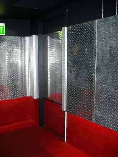 The whole final set of switchbacks and grouping area has been redone with bright red vinyl flooring and checkerplate walling.