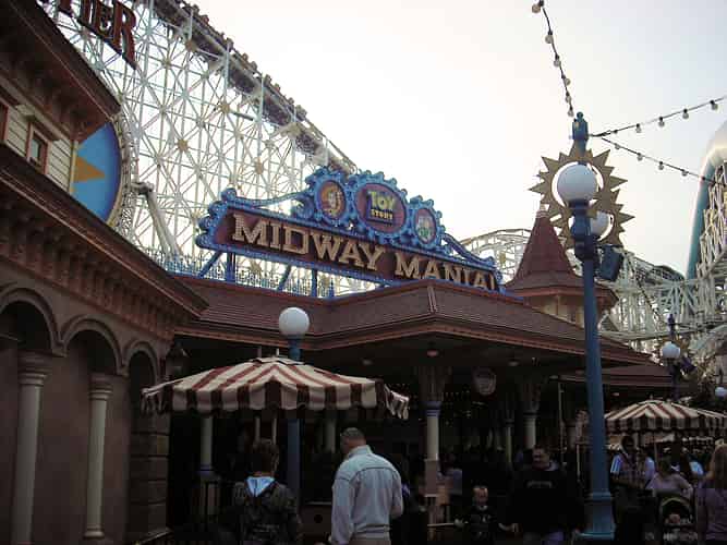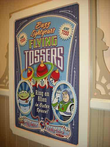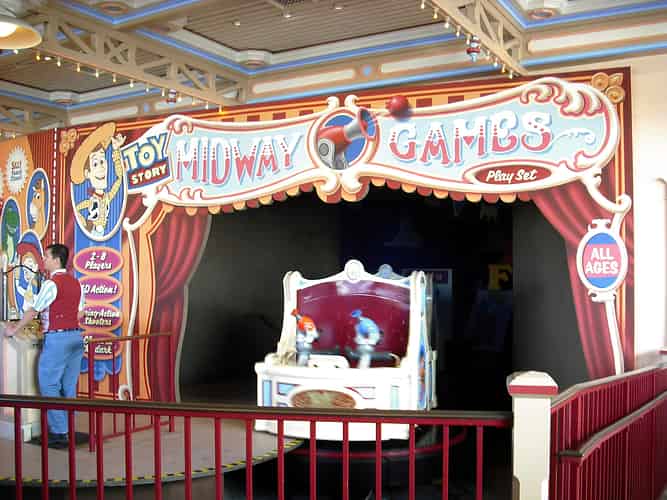 Toy Story Midway Mania is an interactive dark ride where guests wear 3D glasses, and use a special 'launcher' to play carnival style games on large screens.
