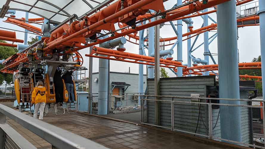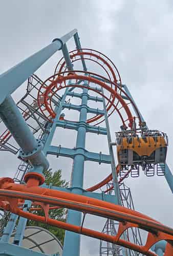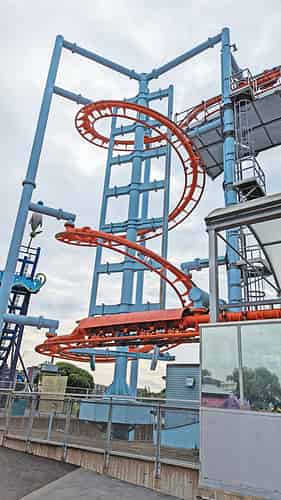 The lift hill is a spiral, with a revolving central frame. A small hinged section at the bottom of the frame catches the car and forces it up the spiral.