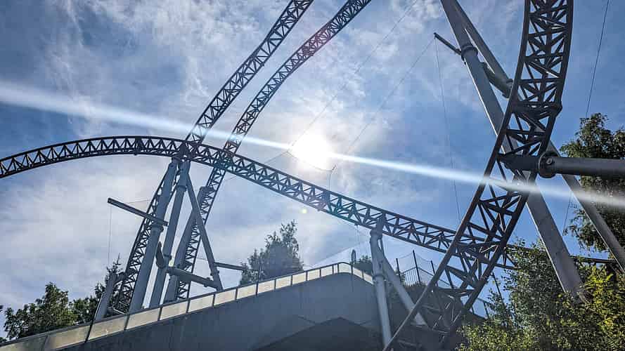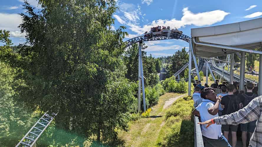 The queue line passes over the transfer track, and gives a good view of the expressions of riders as they arrive back from their ride.