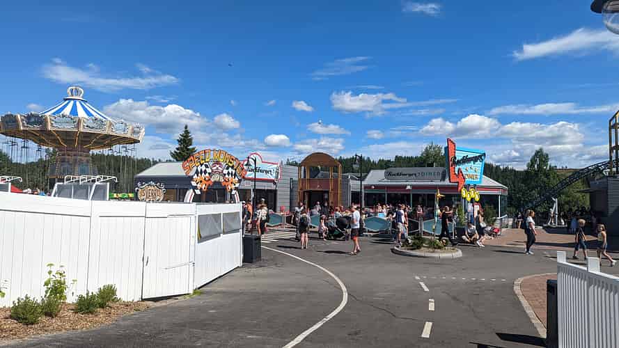 A grandstand runs the length of the launch track and backs onto the Bumper Cars (Store Radiobiler)