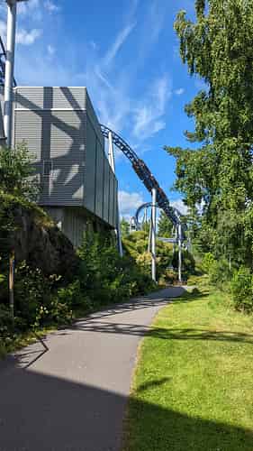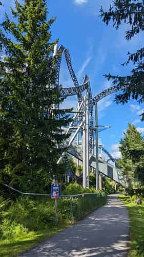 The first two inversions come in the form of a 'Norwegian Loop...A twist and dive into a half loop, followed by another half loop and twist. Overall it resembles a pretzel.