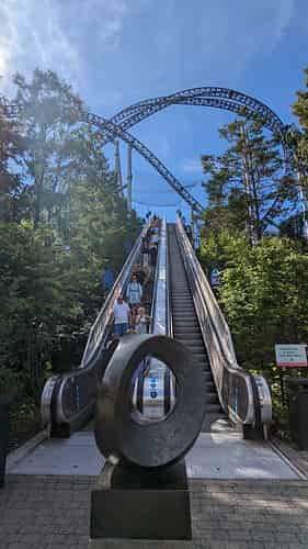 The track famously wraps around the entrance escalator to the park.