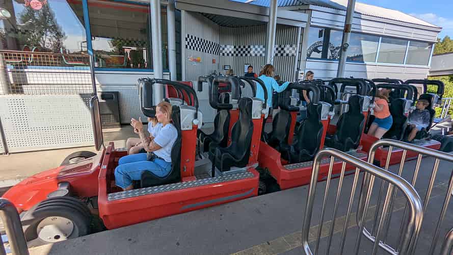 The race car themed trains seat 12 riders.