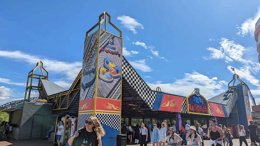 Approaching the attraction down the main street of "Route 66".