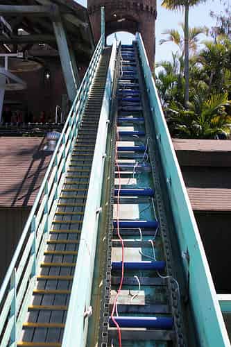 These simple modifications to the trough create enough water turbulence to slow the speed of the boats as they come into the lift hill.