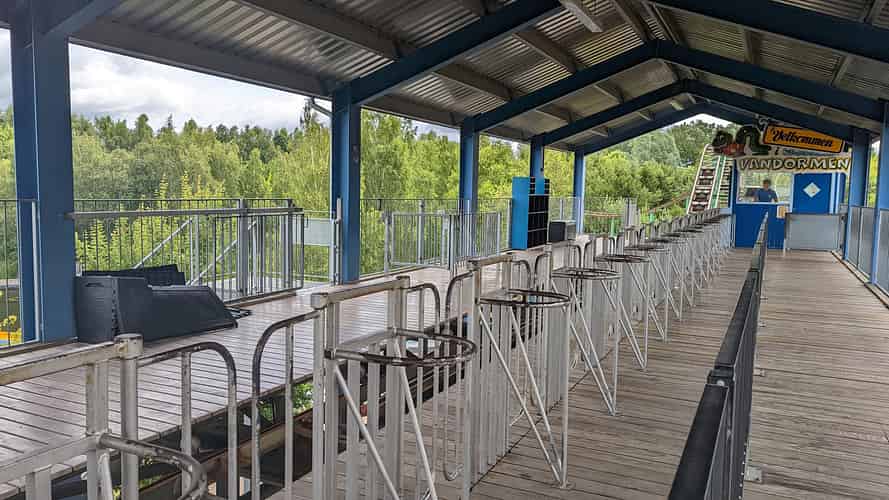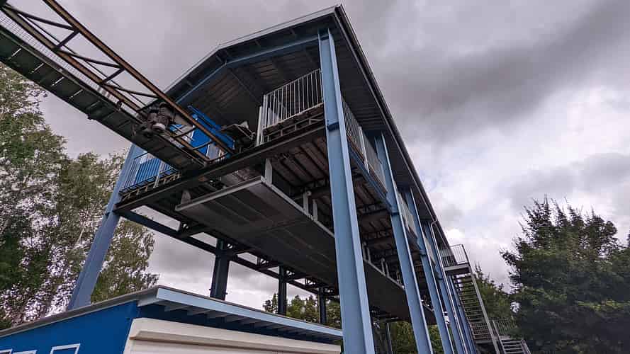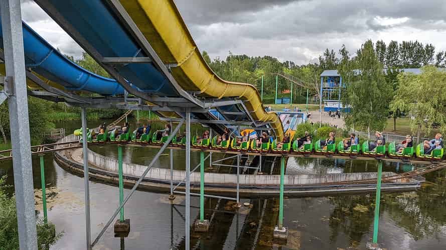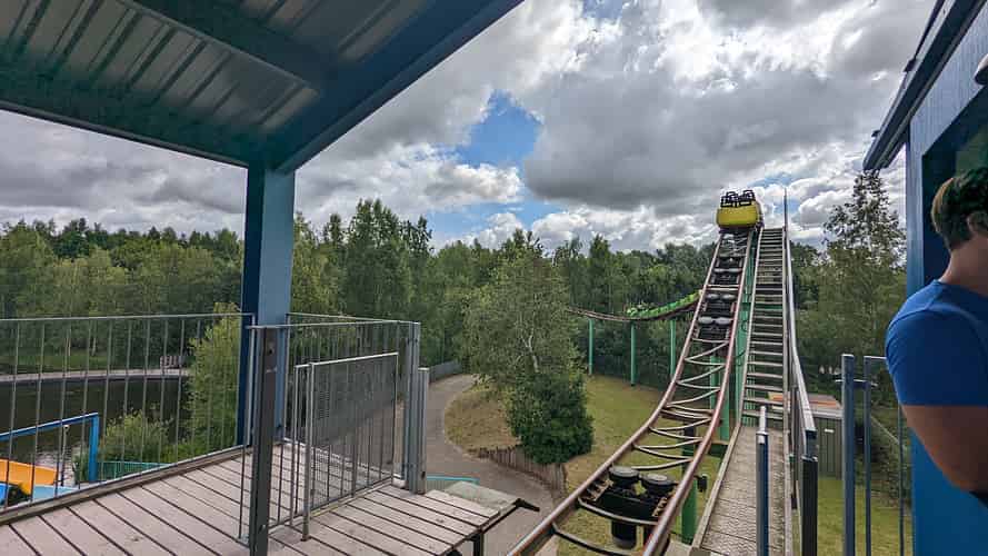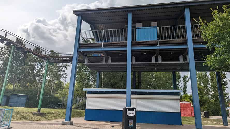 The ride previously operated at Panorama Park in Germany. The previous location of the ride was quite hilly, so here at flat BonBon Land, the ride is several meters in the air.