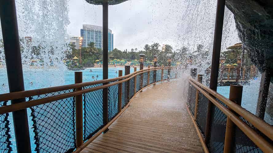 The wave pool in the shadows of the Krakatau volcano. The top section of Ko'okiri Body Plunge is transparent, and passes through the waterfalls cascading down the mountain.