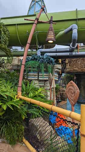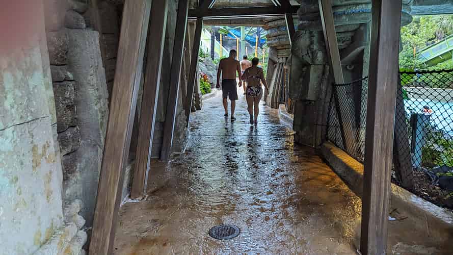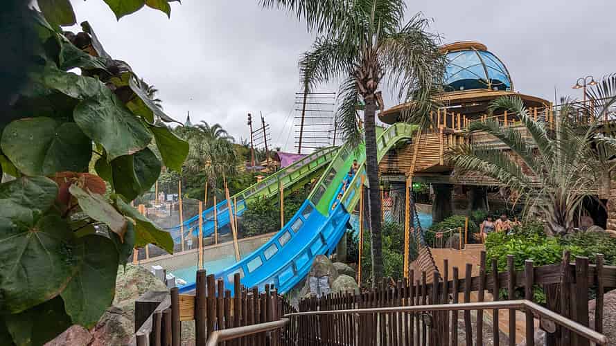 From there, the slide features several drops and inclines, winding through the base of the volcano.