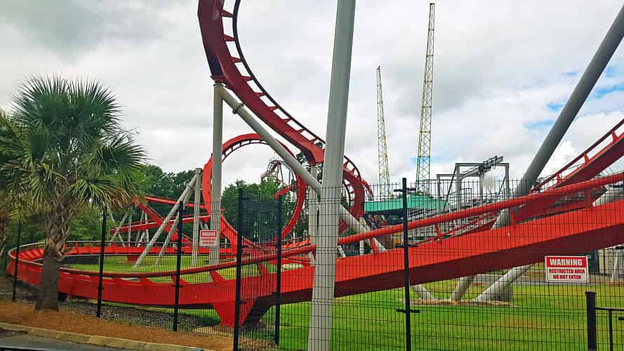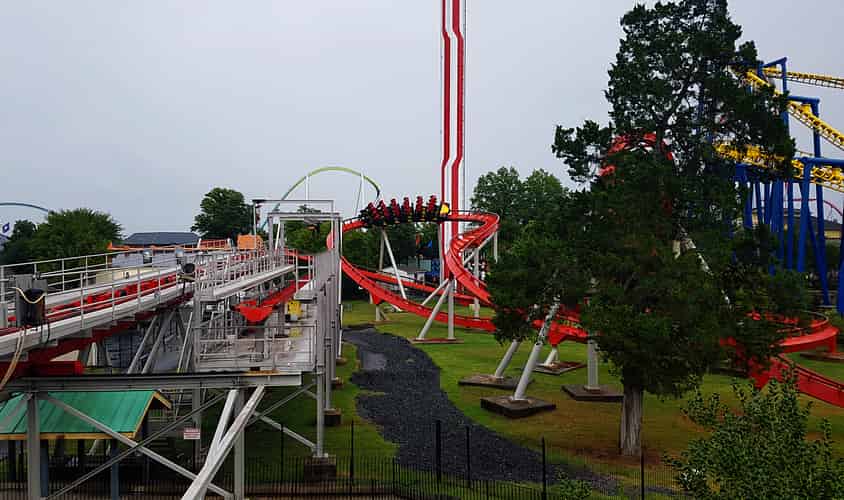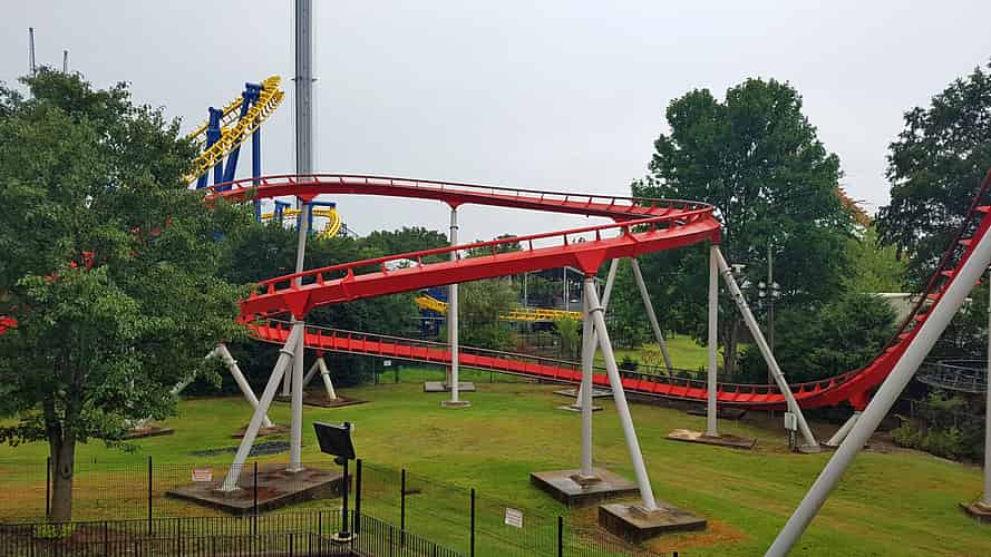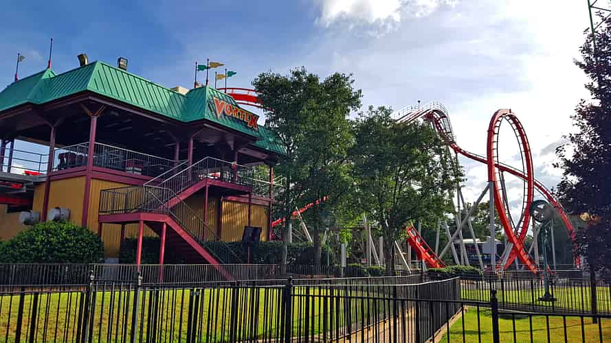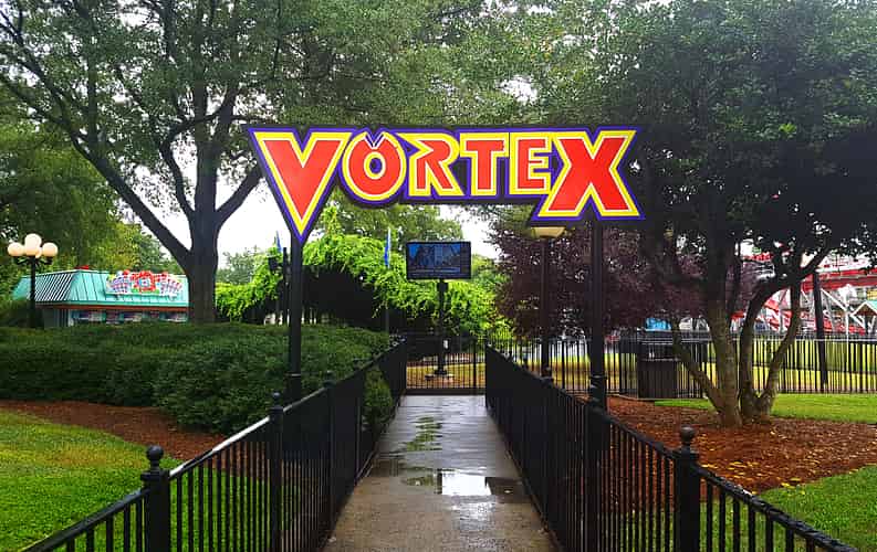 Vortex begins with a twisting first drop and loop, adjacent to the Carolina Goldrusher.