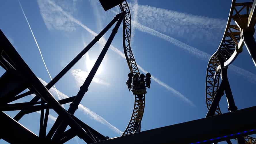 The twisting airtime hill is seen on the left.
