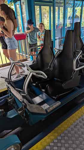 The ride uses new trains from Sunkid, where you are held in only by a metal bar across your stomach.