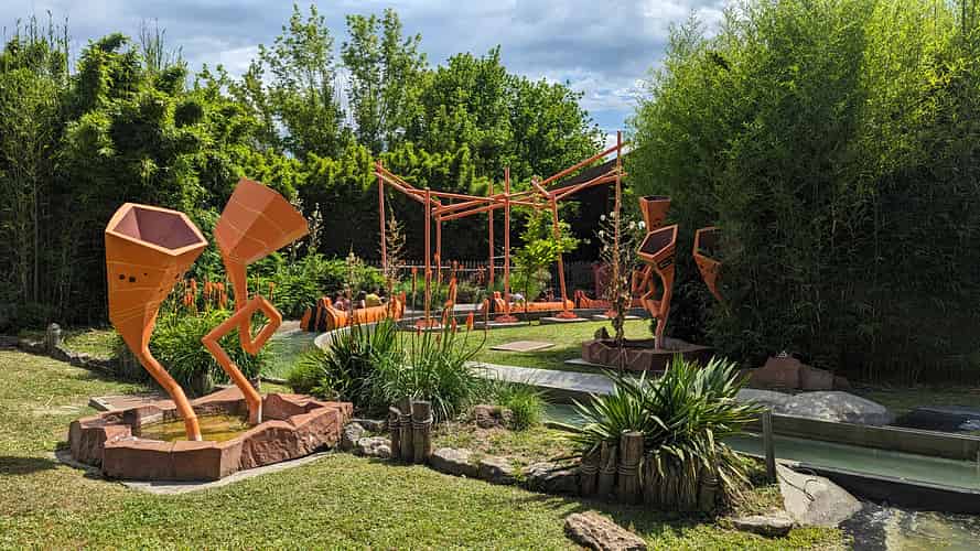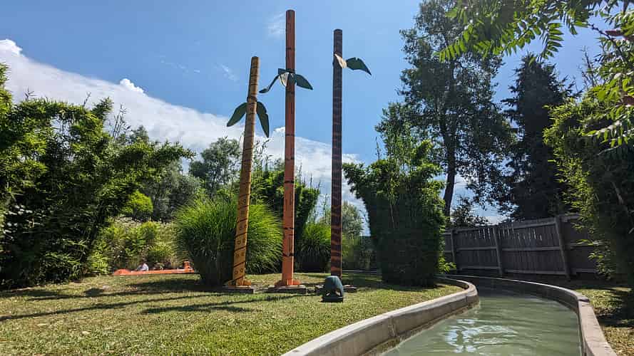 Colourful tribal totems that looks like a mix of African and Polynesian.