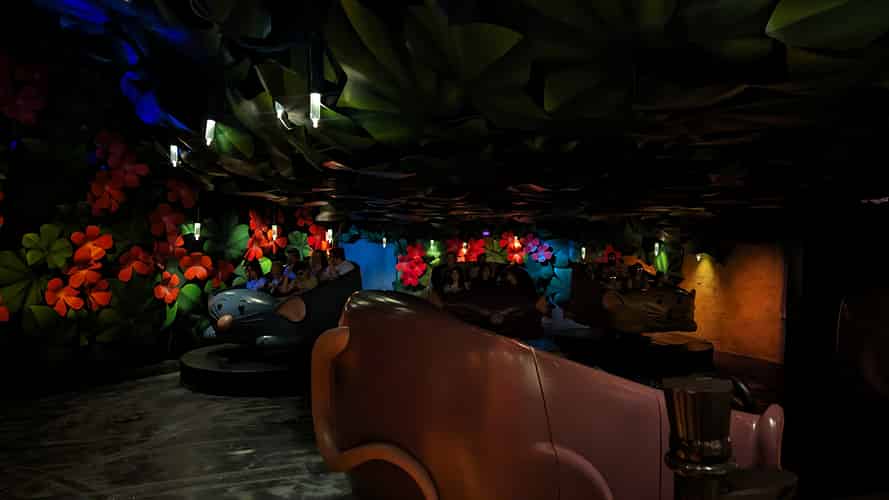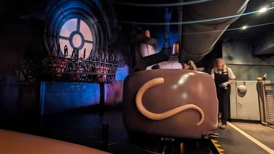 The ride vehicles themselves are trackless, seat 6, and are also themed like giant rats.