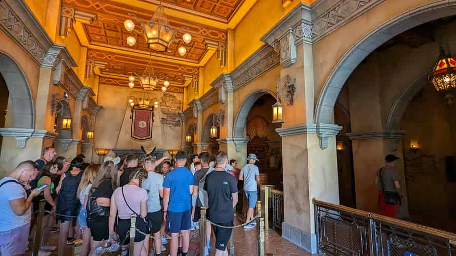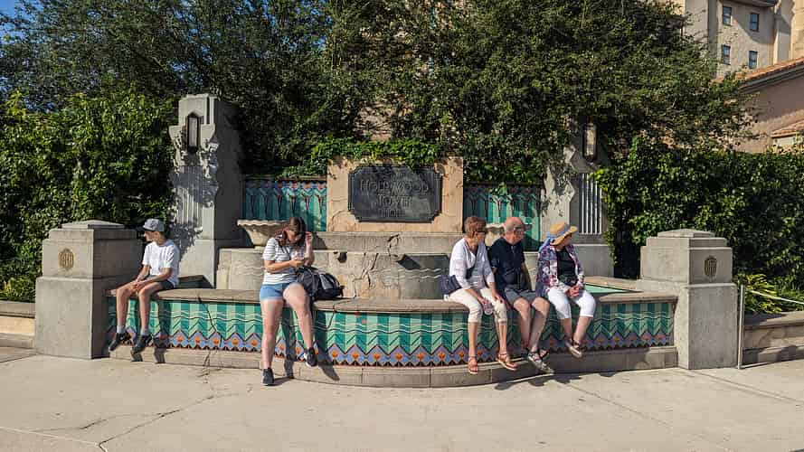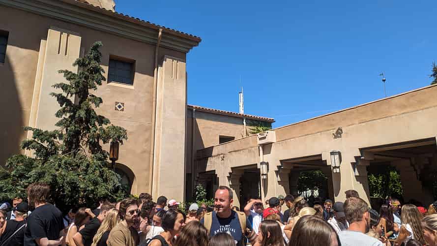 The first bit of the queue is in the Hollywood Tower Hotel courtyard.