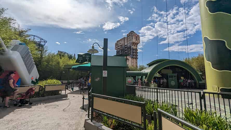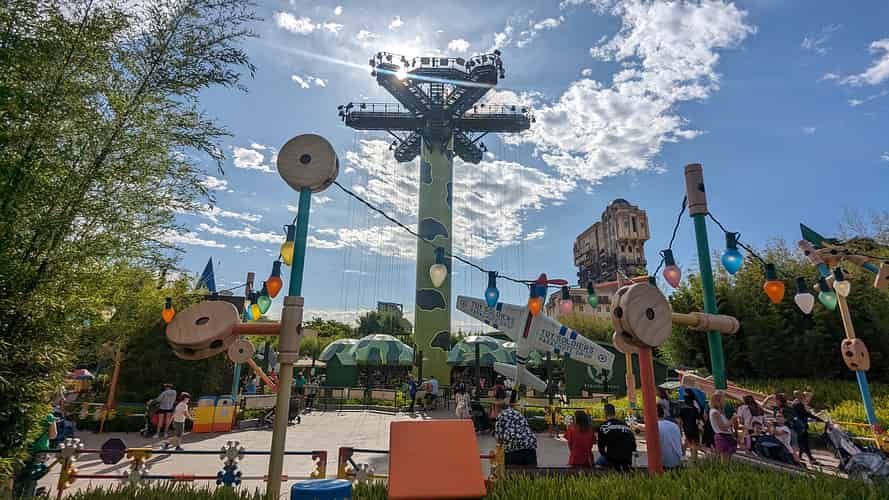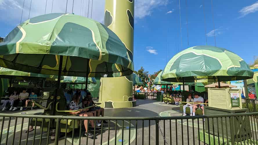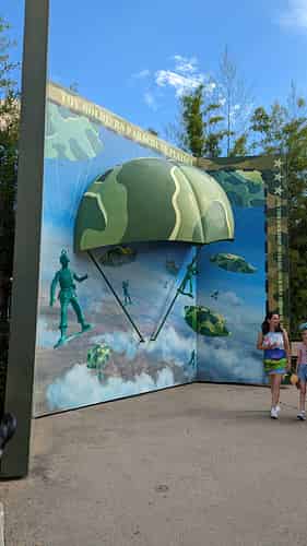 Toy Soldiers Parachute Drop dominates the skyline of Toy Story Land.