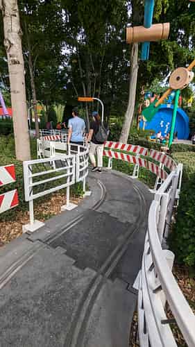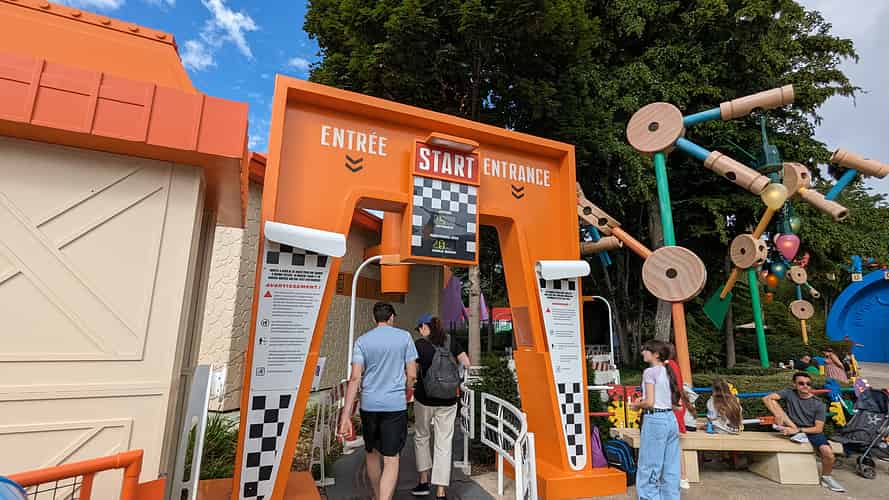 The queue line is themed like segments from a slot car track.