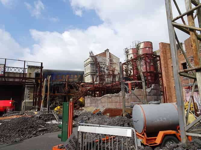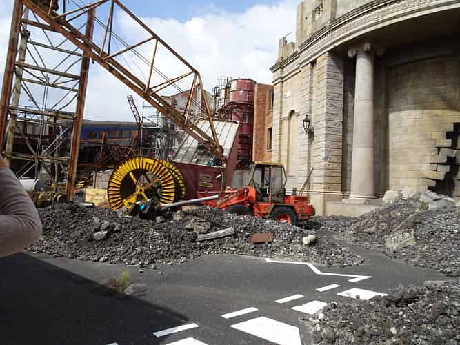 The segment of the ride features fire effects and a destroyed London.