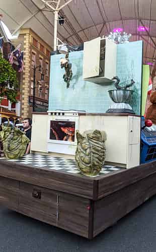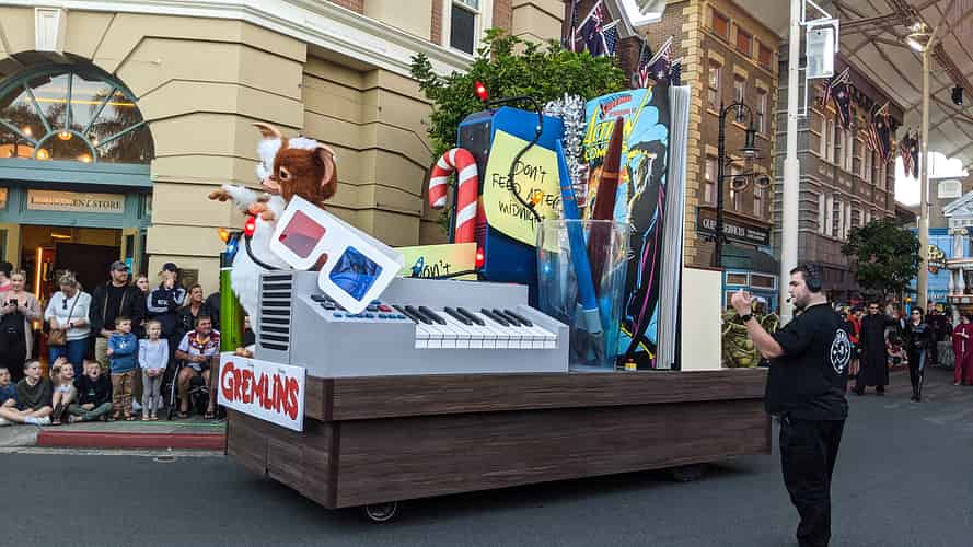 The biggest laughs come on the back of the float, with this re-creation of the infamous kitchen scene from the Gremlins, complete with one being pulverised in a food processor.