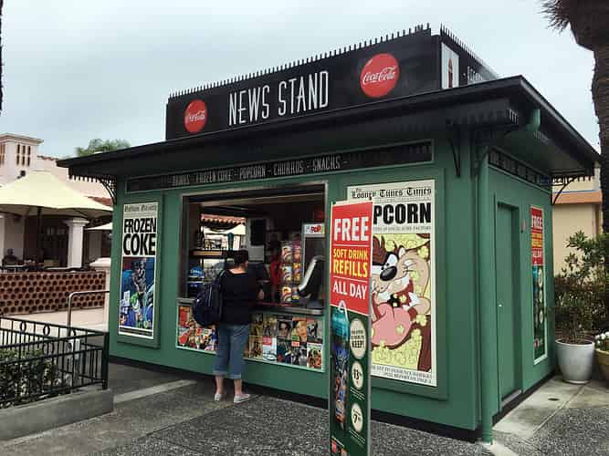 Newly renovated, the expanded News Stand serves largely as a drink refill station and snack shop. Movie World is really emphasizing their unlimited drinks program as of late.