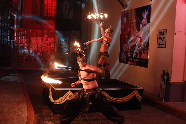 Acrobats performing throughout the night.