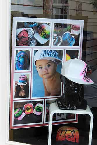 Flanked by two dogtag machines is this piece of retail brilliance... custom gangsta caps.