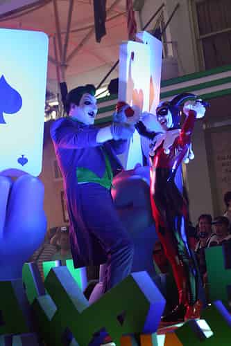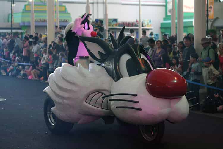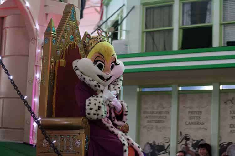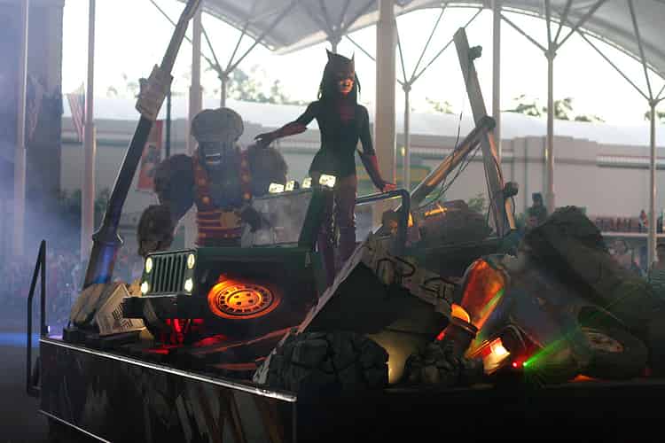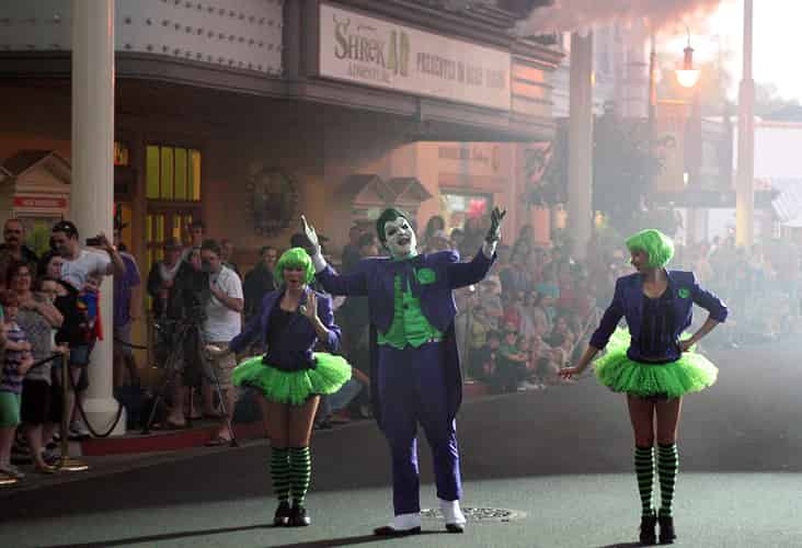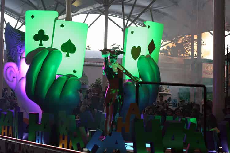 Lights in place for the Heroes & Villains night parade. Note that by installing a roof over Main Street, for just the added cost of some duct tape, Movie World can get away with not having to spend money on weatherproof domes.