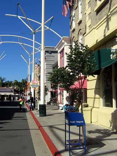 The stark white structural components originally seen have begun to be repainted in a cream colour, perhaps to better match the surrounding buildings.