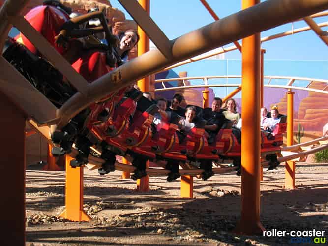 After the camel back it dives into a trench and into the third inversion, a side winder.