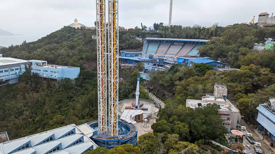 In the background you can see the Ferris wheel and Dragon roller coaster. In the foreground are the twin towers of the Abyss Turbo drop, as well as the new Wild Twister top scan ride.