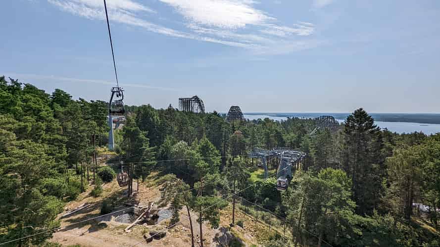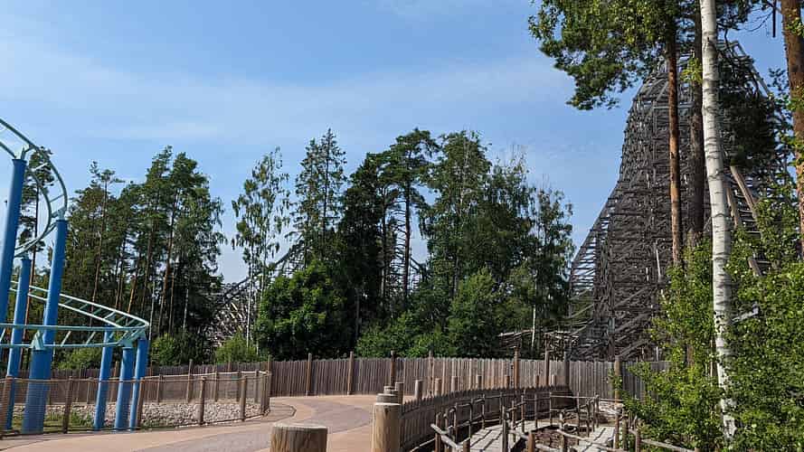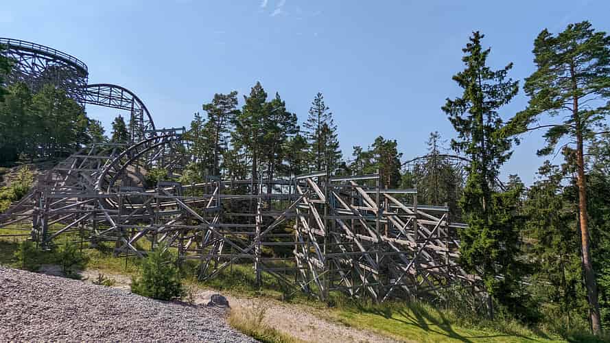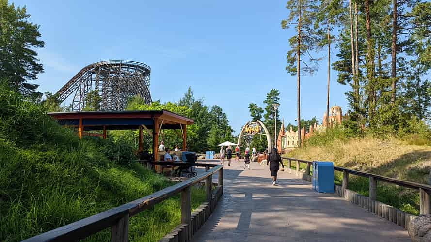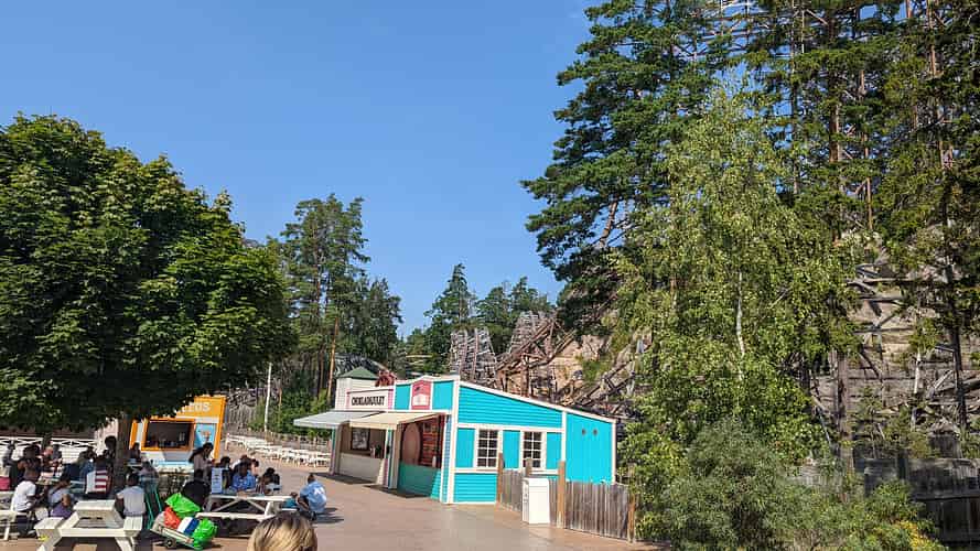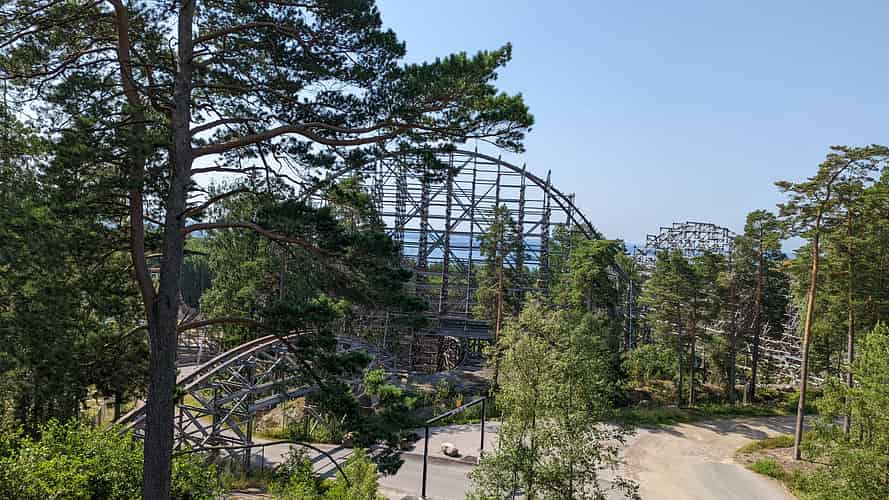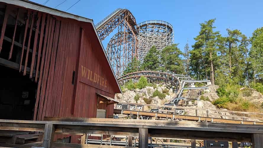 Sjorovarskeppet (Pirate ship) in front of Delfinexpressen (Family coaster) and Wildfire (Wooden Hybrid coaster)