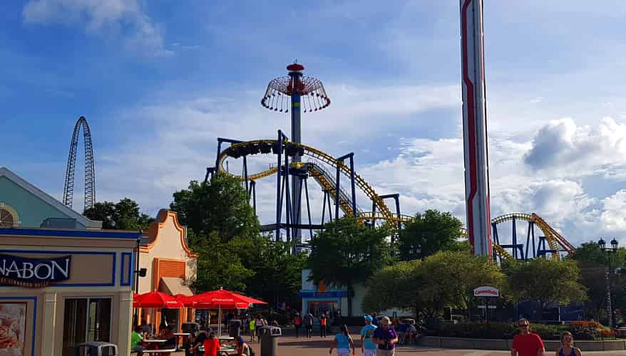 Once inside the park the first drop of Nighthawk and Windseeker come into view.