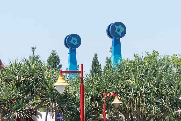 Those familiar counterweights peak out over the tops of the pandanus trees that line Ocean Parade.