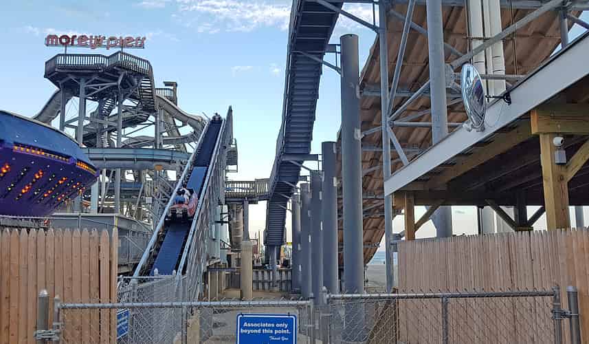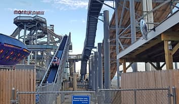 The 2nd conveyor of Zoom Phloom emerges from the tunnel, next to the Wipeout racing water slide.