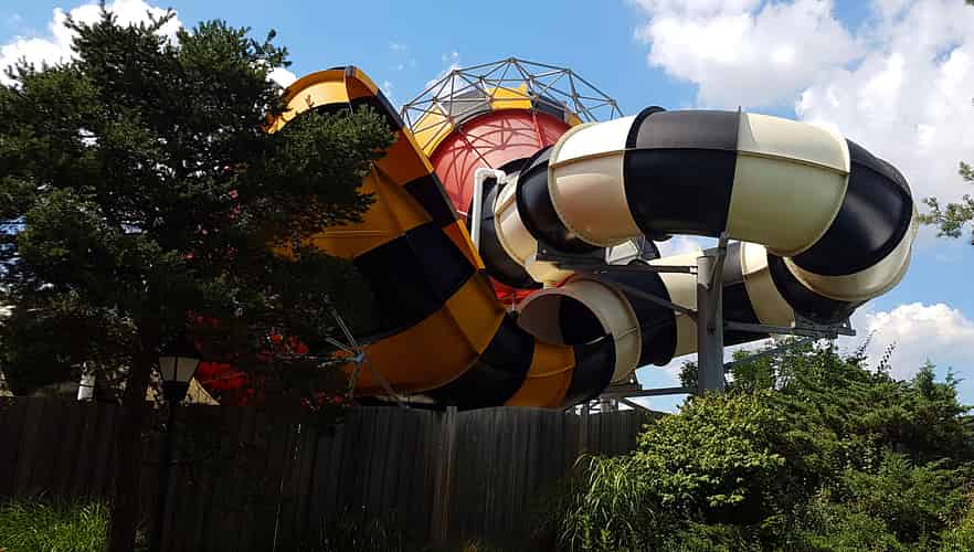Mega Wedgie drops riders straight down whilst Dive Bomber features interlocked helices. Wipeout is a double funnel slide.