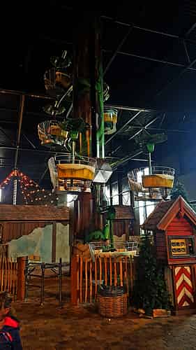 Wirbelbaum is essentially two small ferris wheels on a tower. One wheel is lifted up whilst it runs, whilst the other one loads.