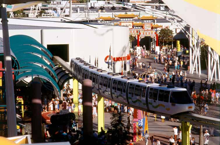 The monorail glides above what is now Southbank Parklands in Brisbane.