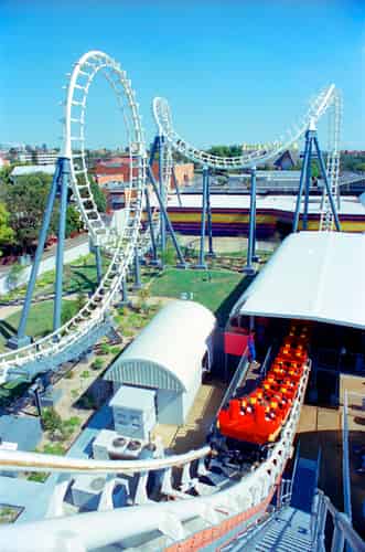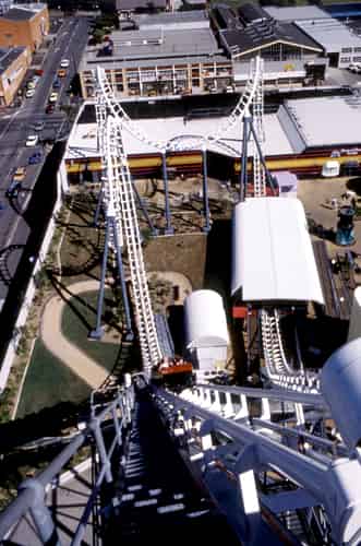 Centrifuge was a Vekoma-built attraction, utilising track and train designs licensed from Arrow Dynamics.