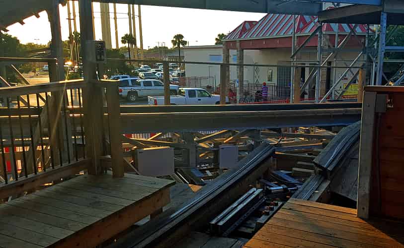 The train returns to the transfer track at the bottom of the first drop, where it is brought to a stop. A curved section of track is slid across...