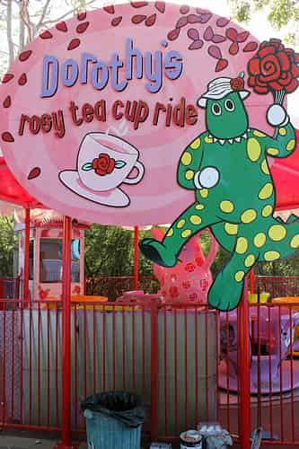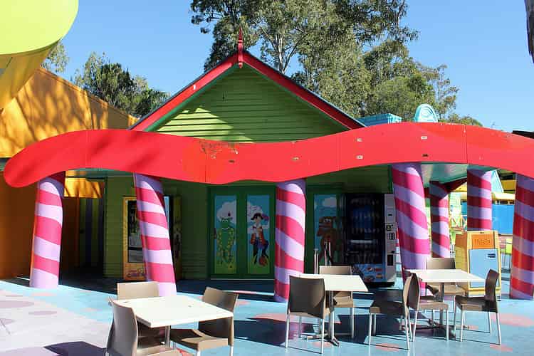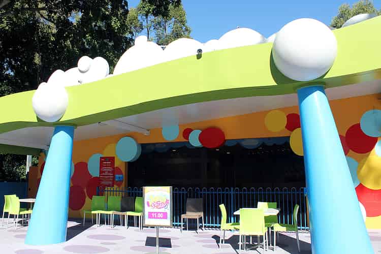 Much of Wiggles World is undergoing a retheme for the new area. Here we see the (closed) Yummy Yummy store – what once served "delicious fun and healthy choices" has been replaced by two junk food vending machines.