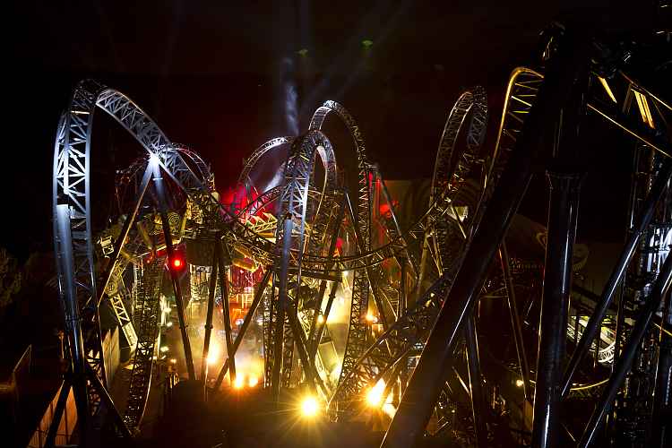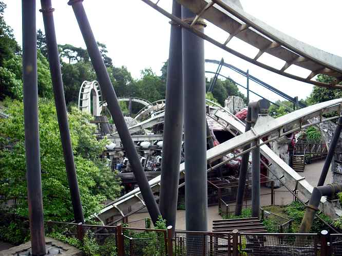 Right before you enter the loading station you get this view, so you can see a train whip through the final corkscrew, and then a few seconds later see the expressions of riders after the whole ordeal when they pass through the final brakes.